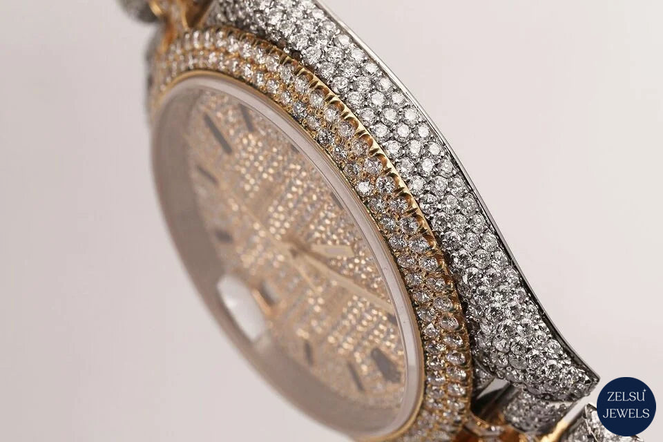 Datejust 41mm Gold Automatic Movement Watch with Moissanite-Studded Diamonds Fully Iced Out for a luxurious and sophisticated timepiece