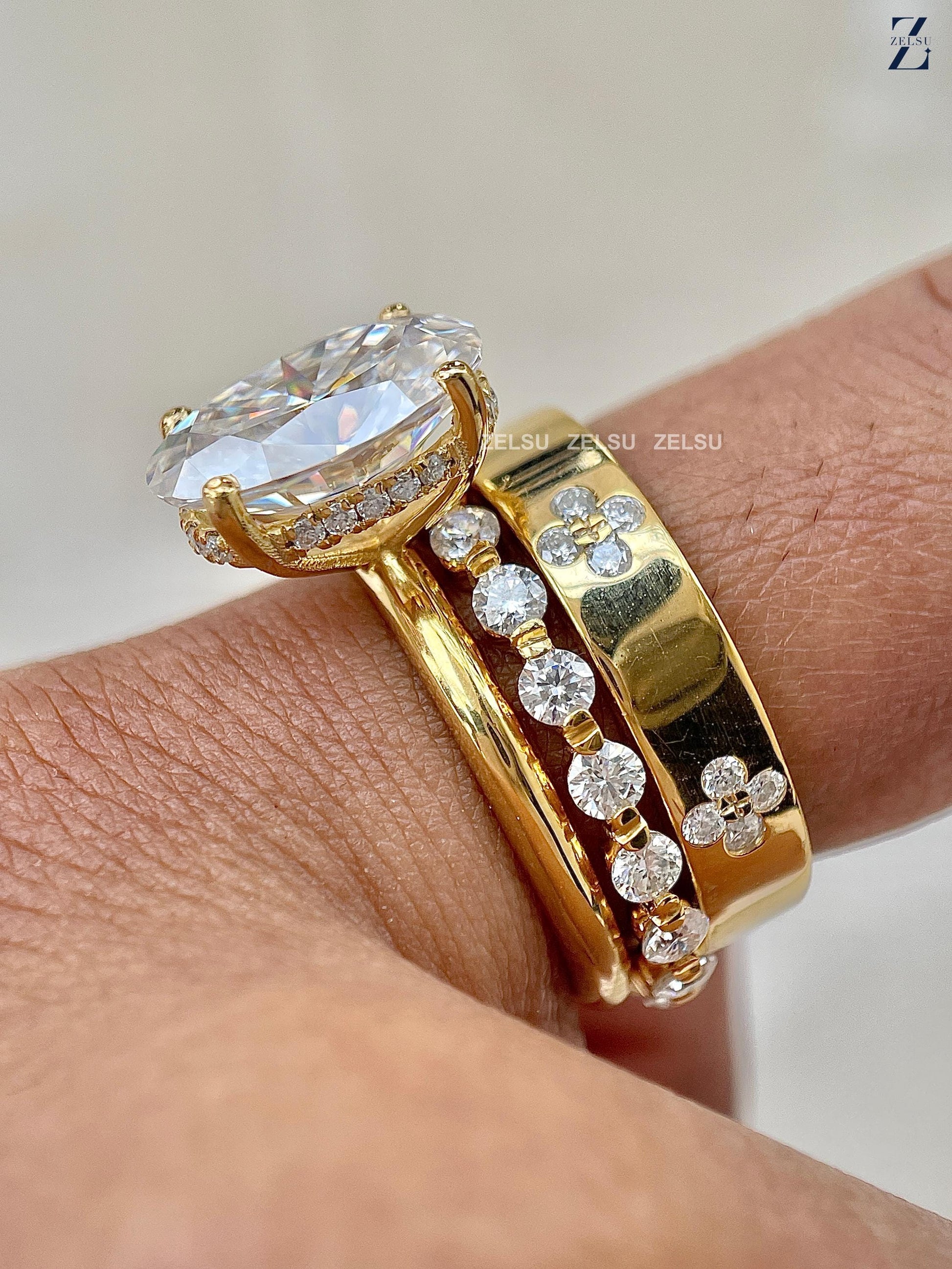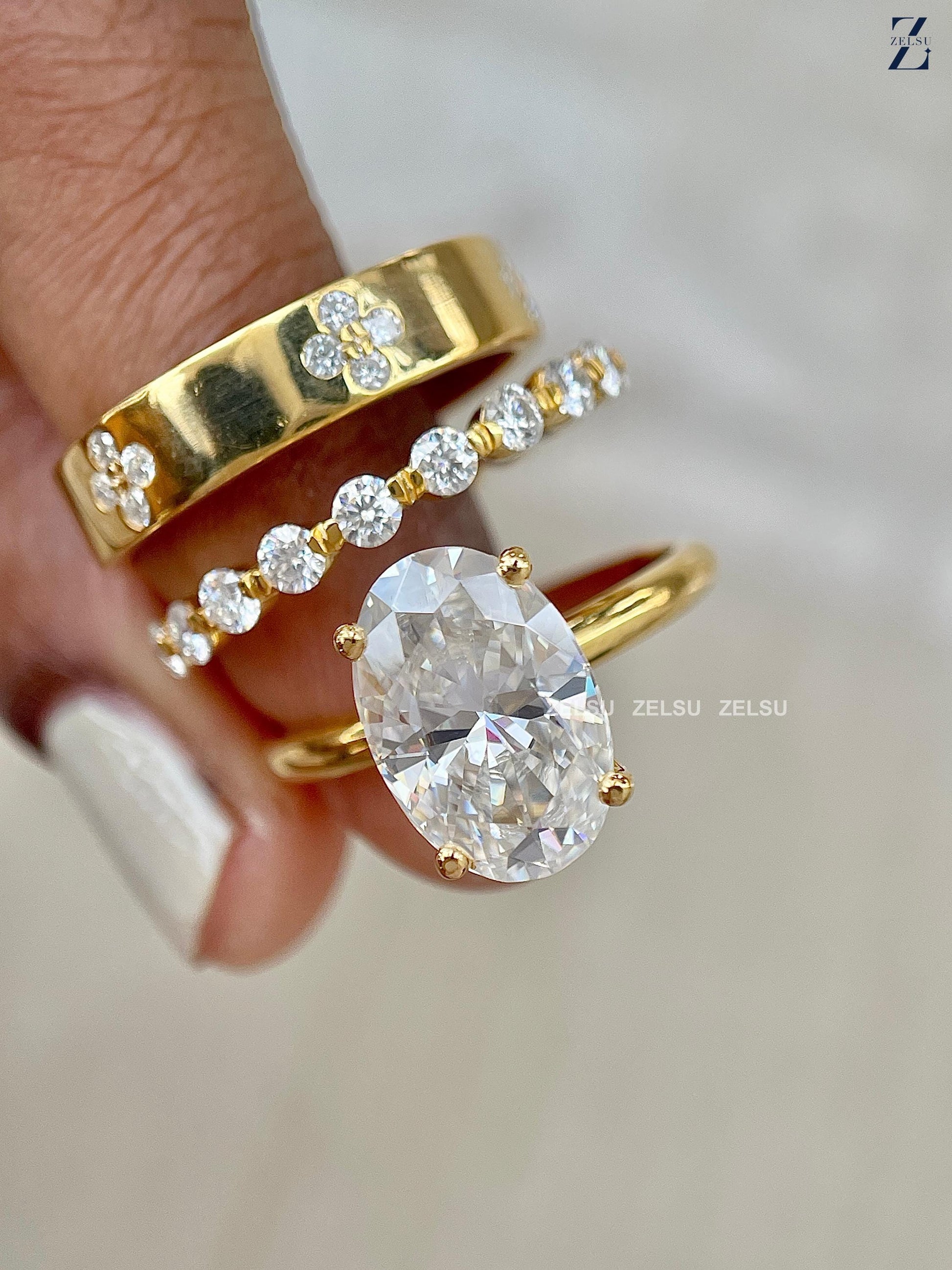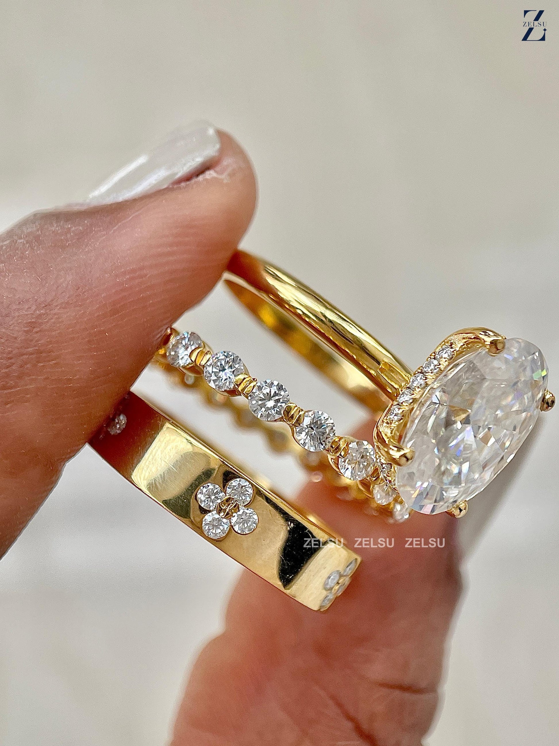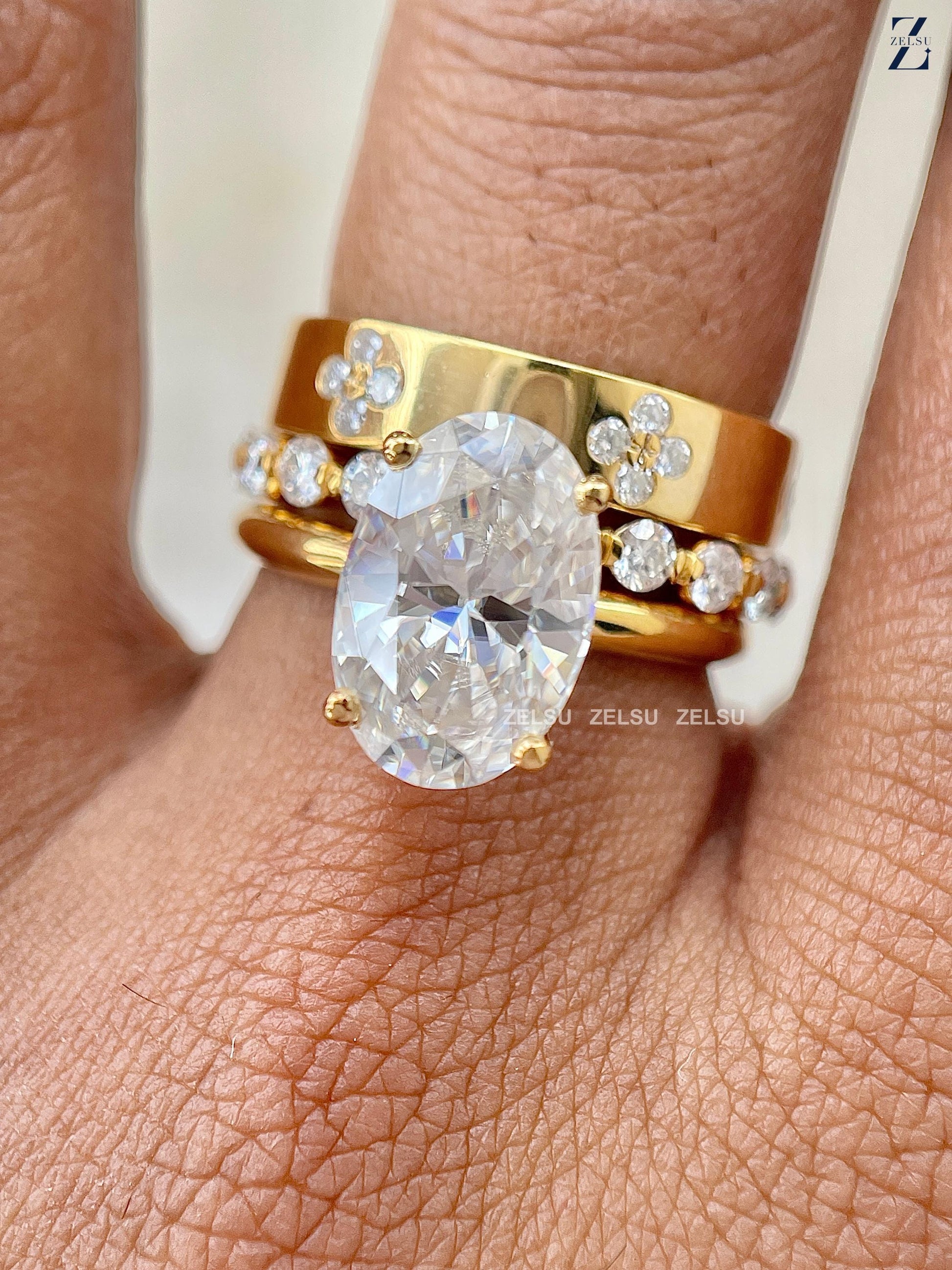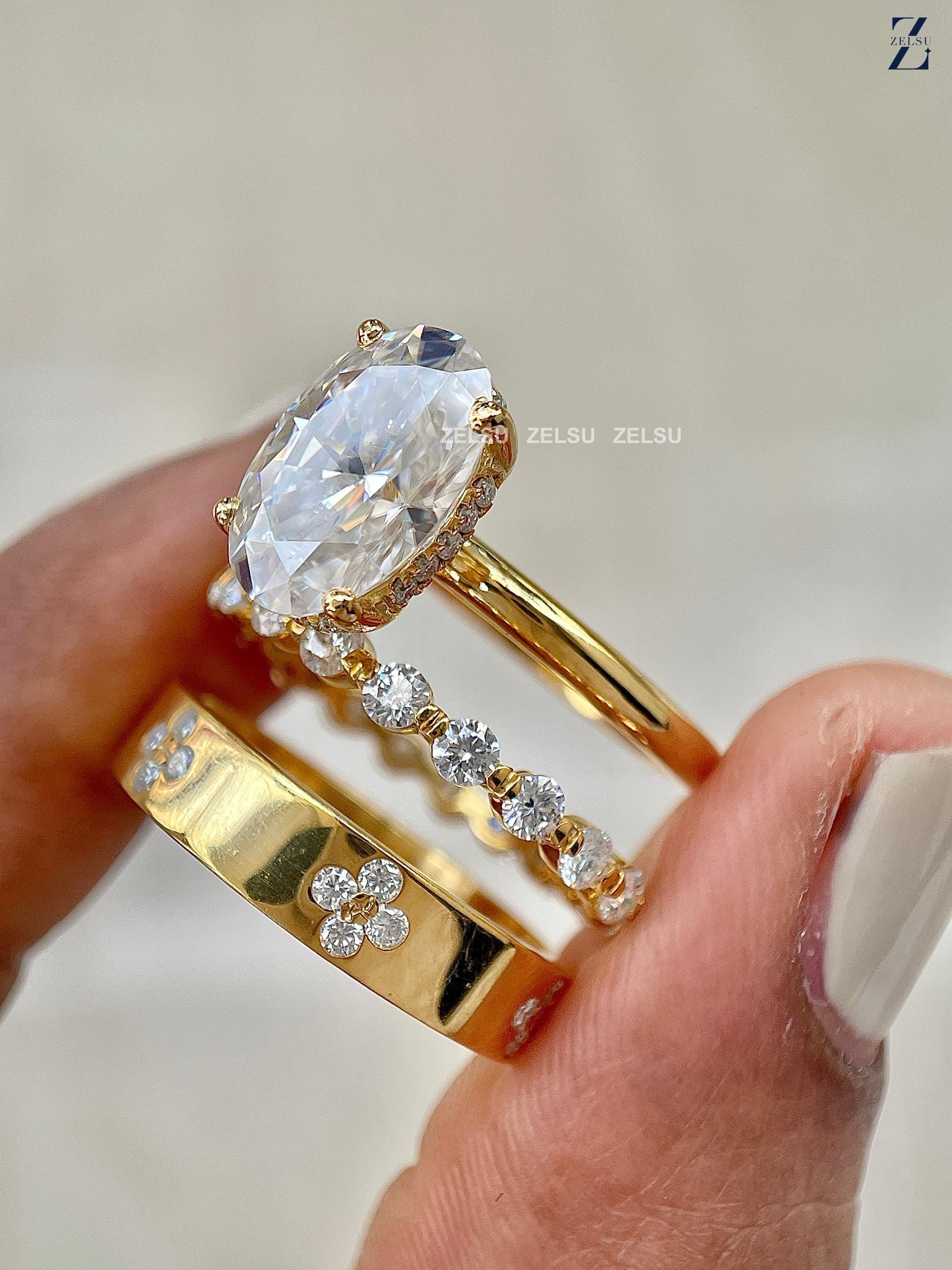 3 CT Oval Cut Moissanite Engagement Ring Set 14K Gold Bridal Ring Set For Her Wedding Ring With Round Flush Set Matching Band Women Gift, oval bridal set, oval moissanite ring, 14k gold ring set, bridal ring set, oval cut ring, oval diamond ring, vintage ring set, engagement ring set, oval engagement ring, wedding ring set, anniversary ring, gift for her, ring for women, Handmade Fine Jewelry for Women, Artisan Jewelry By Zelsu Jewels