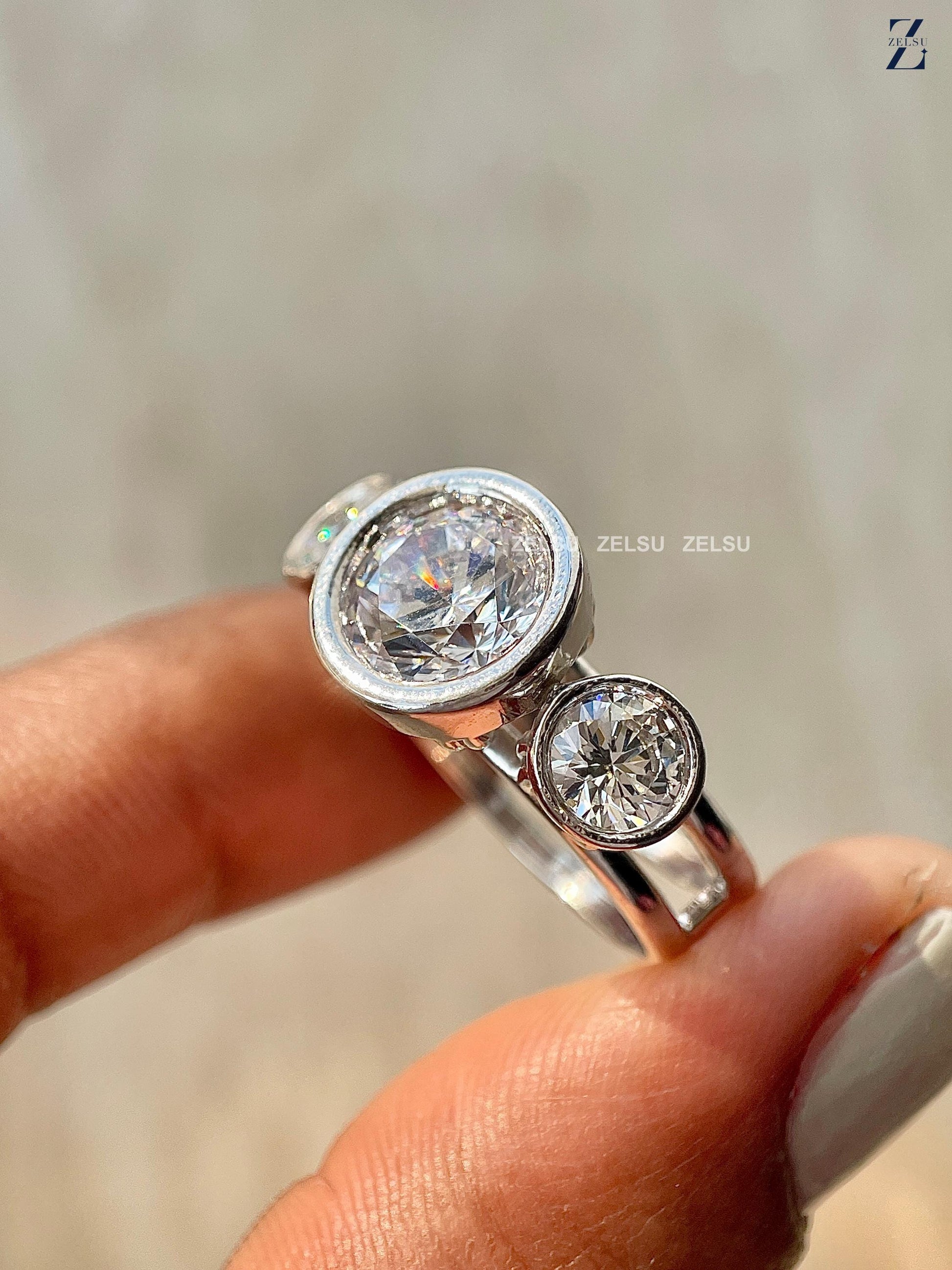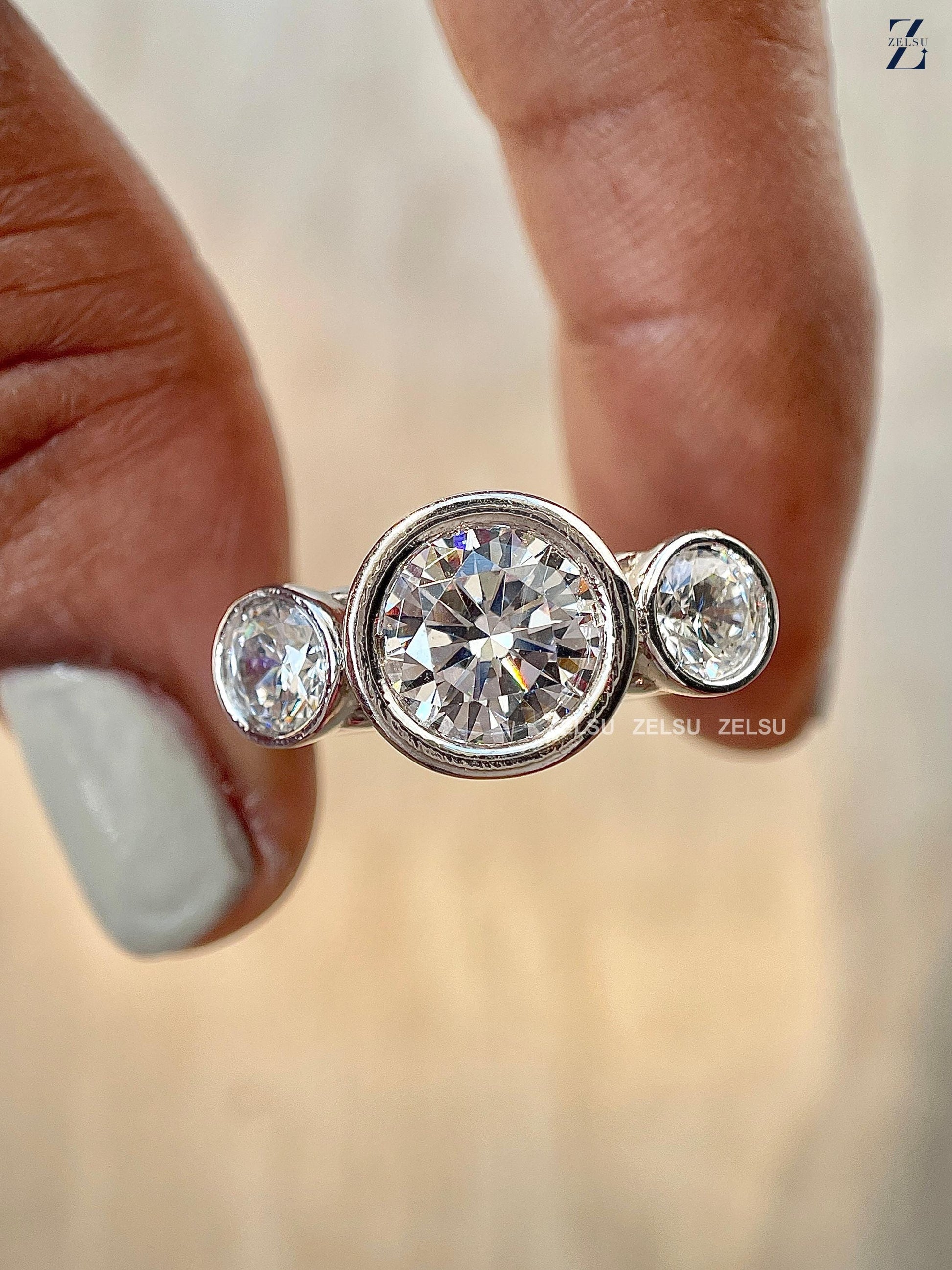 Moissanite Bezel Set Ring / Colorless Round Moissanite Ring / Three Stone Wedding Ring / Colorless Moissanite Engagement Ring