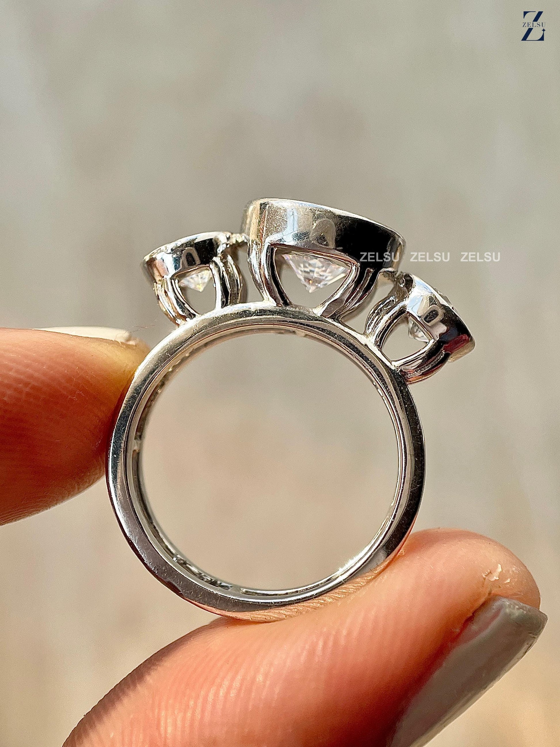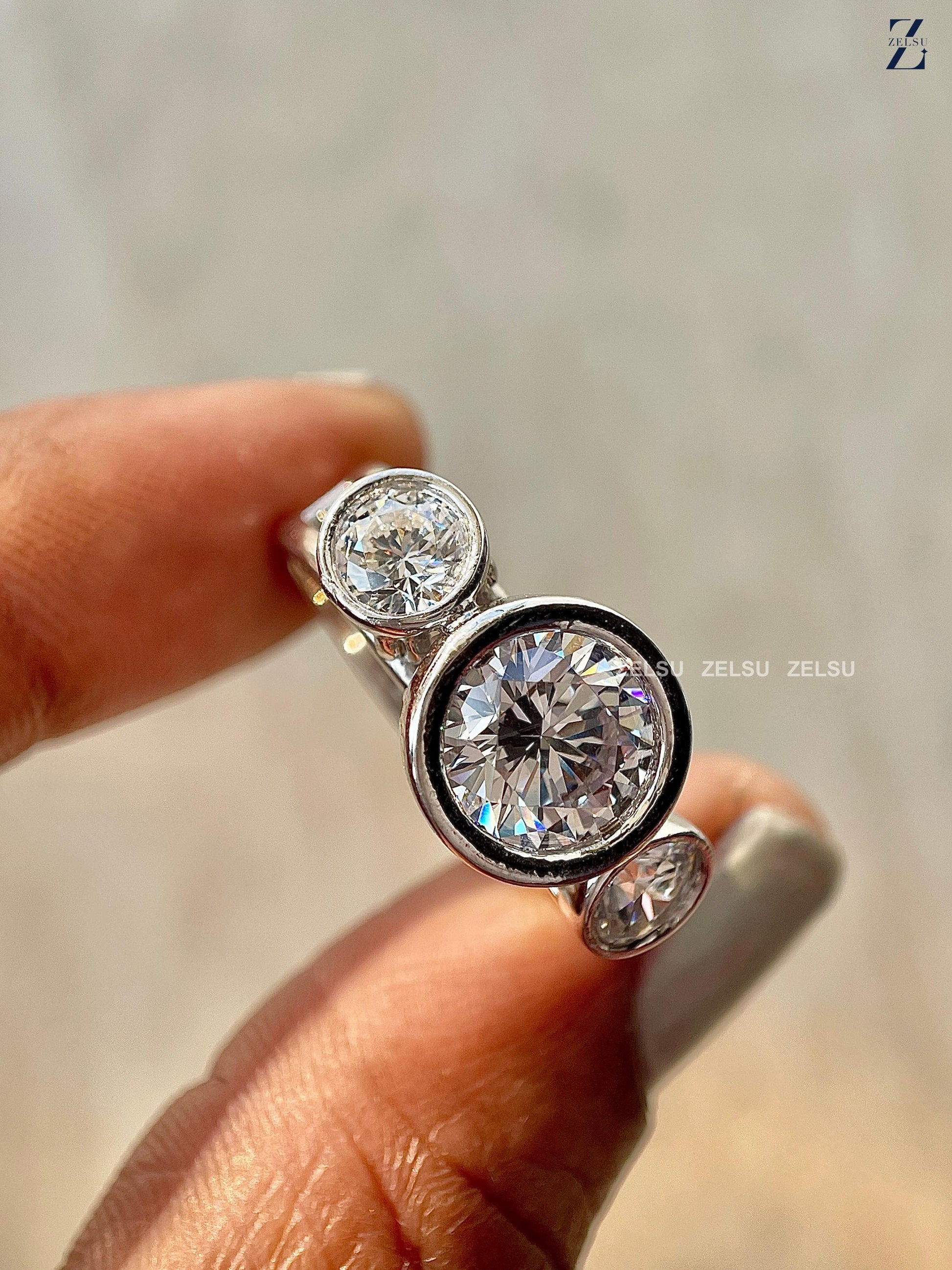 Moissanite Bezel Set Ring / Colorless Round Moissanite Ring / Three Stone Wedding Ring / Colorless Moissanite Engagement Ring, Round Cut Diamond, Round Cut Ring, Three Stone Ring, Bezel Set, Bridal Ring, Moissanite Ring, Engagement Ring, Wedding Ring, Trilogy Ring, Handmade Jewelry, Zelsu Jewels, White Gold Ring, Handmade Fine Jewelry for Women, Artisan Jewelry By Zelsu Jewels