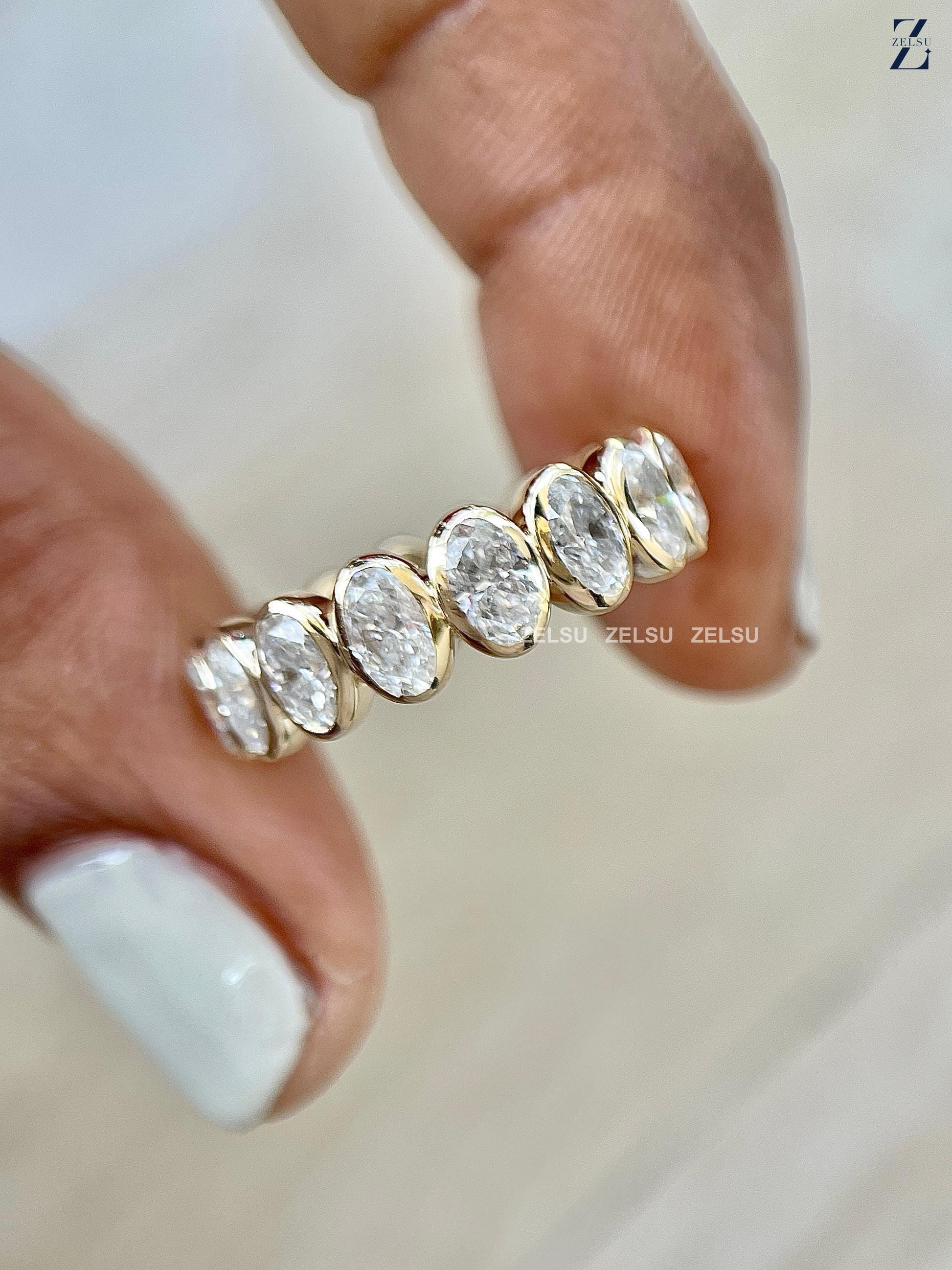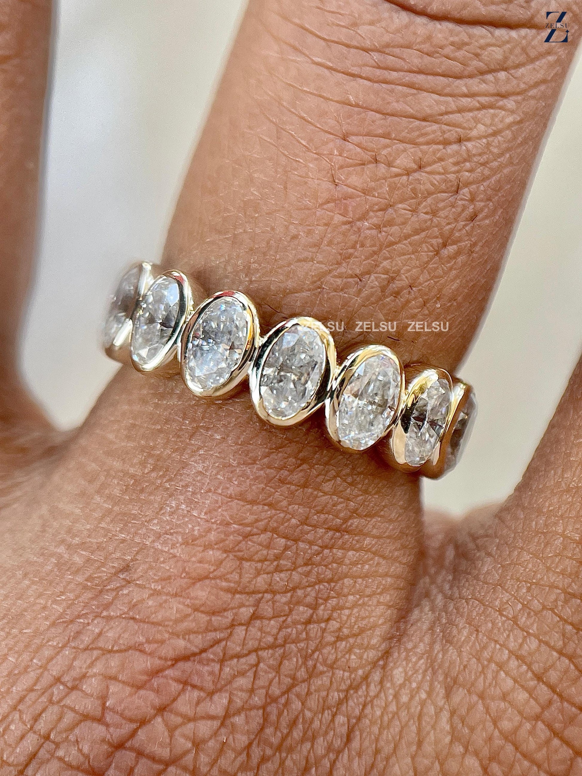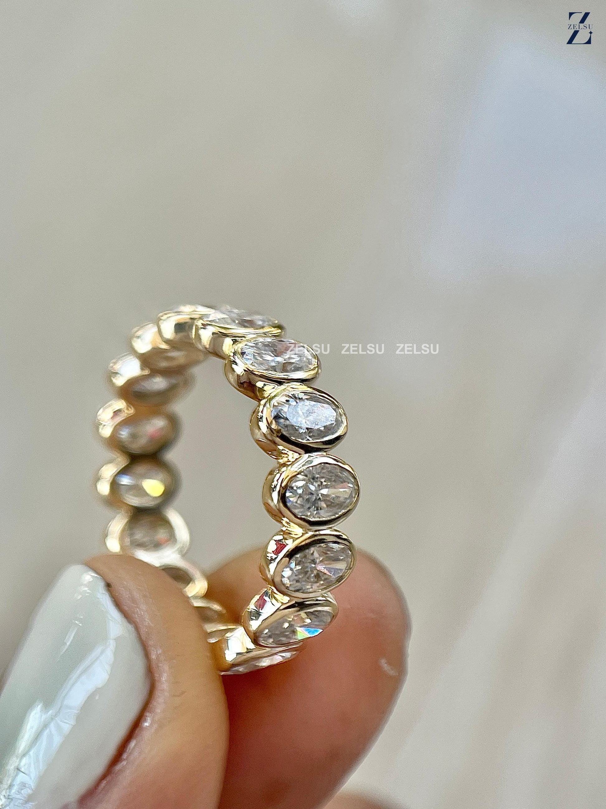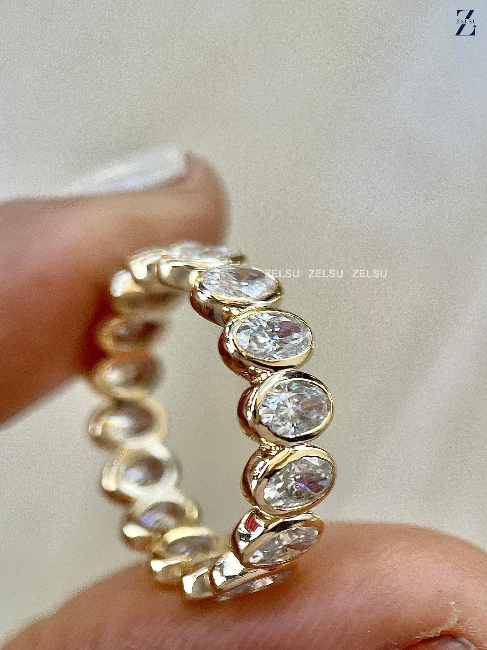 Bezel Set Oval Moissanite Wedding Band - Full Eternity Gold Ring