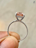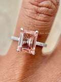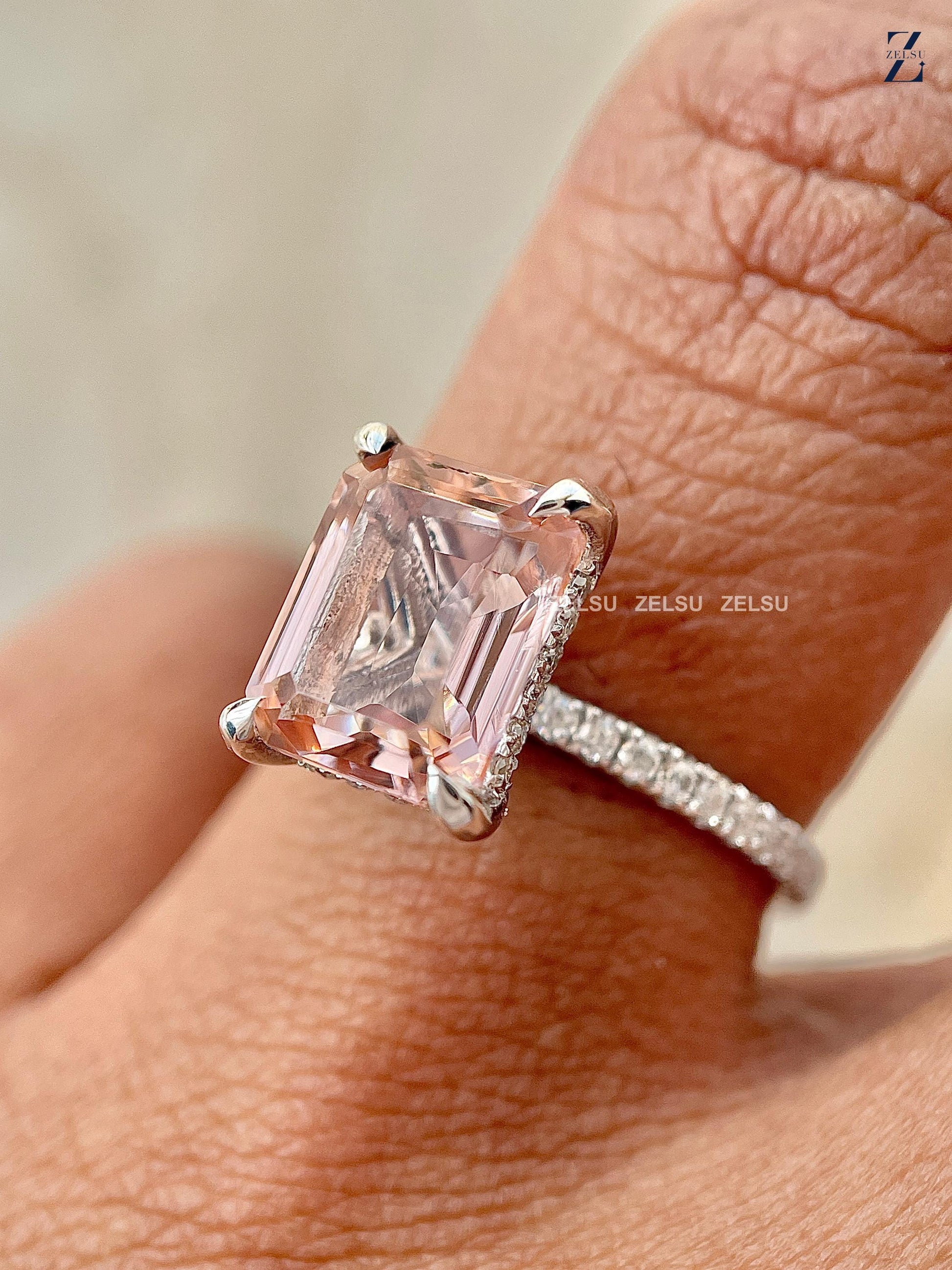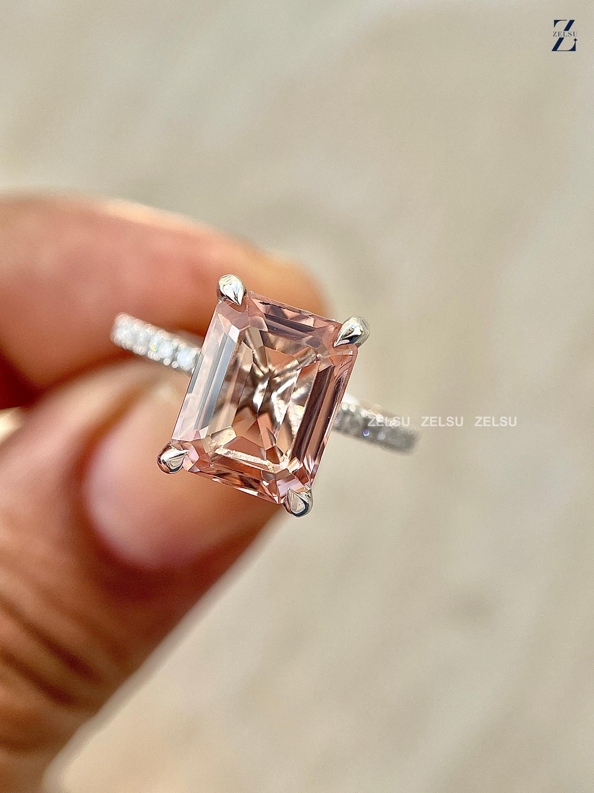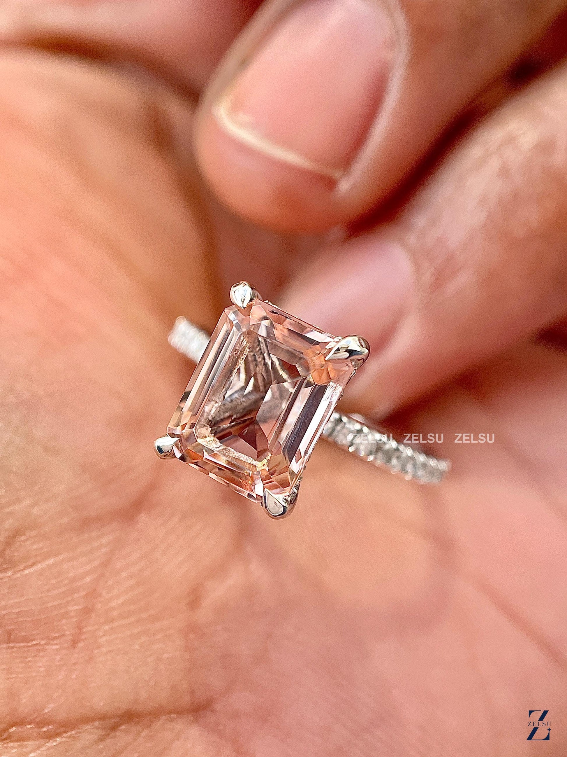 Discover our exquisite Peach Morganite Emerald Cut Engagement Ring, featuring a stunning solitaire design with a hidden halo and half eternity band. This beautiful promise ring or anniversary ring for women is crafted in luxurious 14K White Gold by Zelsu Jewels.